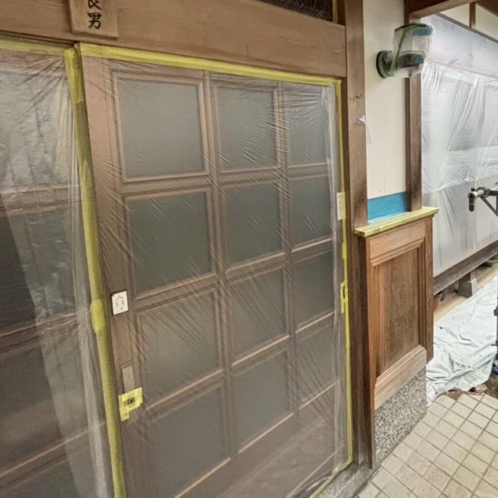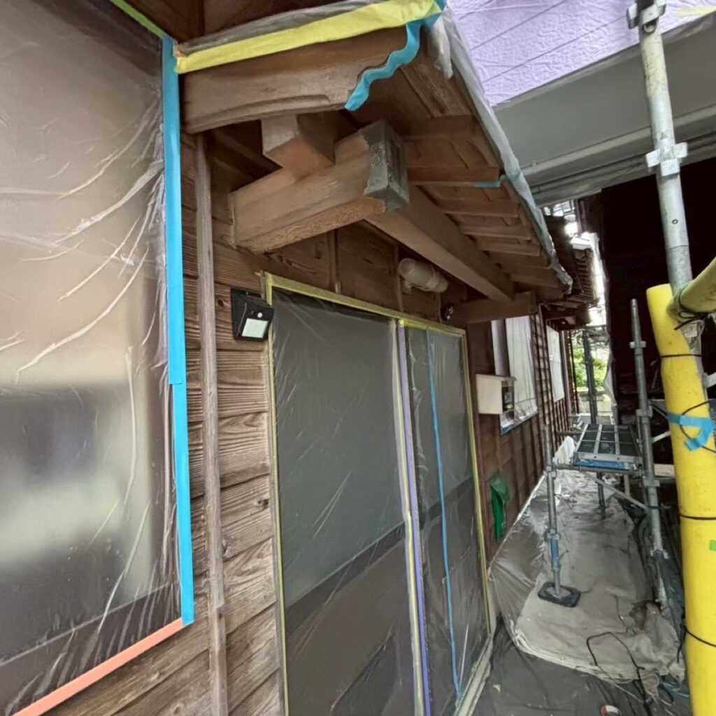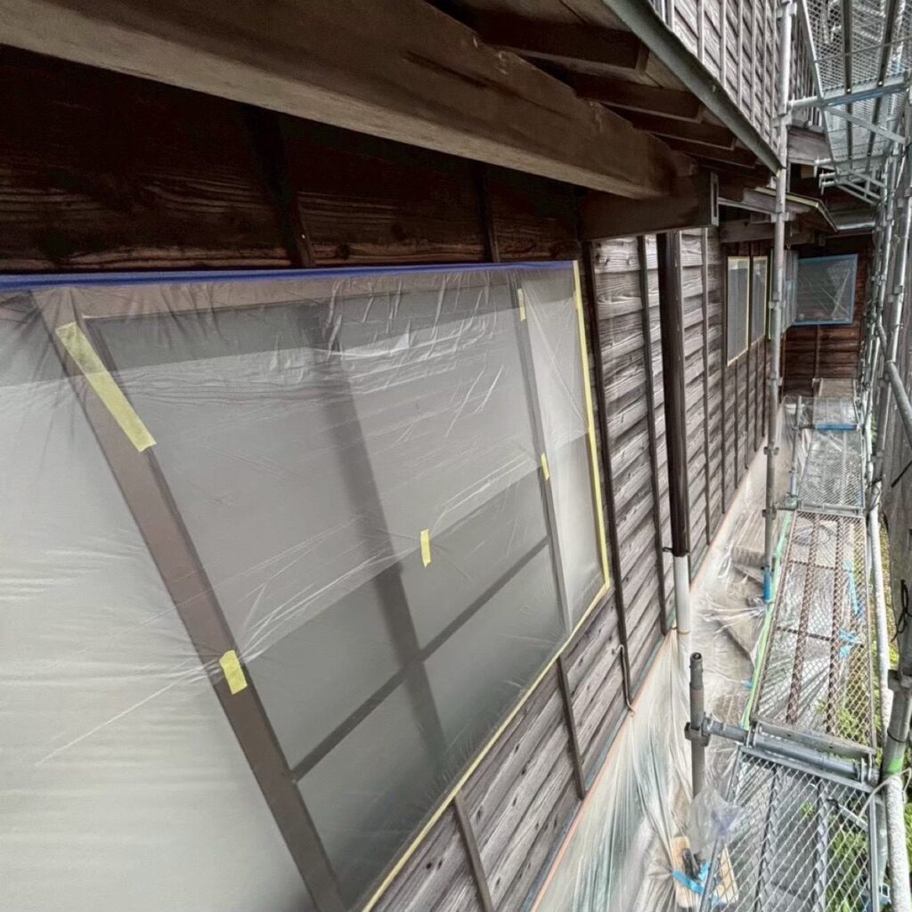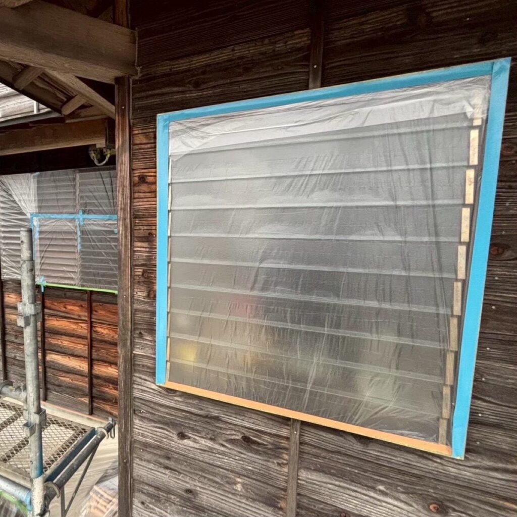 ➡外壁塗装を行う際に「塗装する箇所以外に塗料が付着しないようにビニール等でカバーすること」です。📝