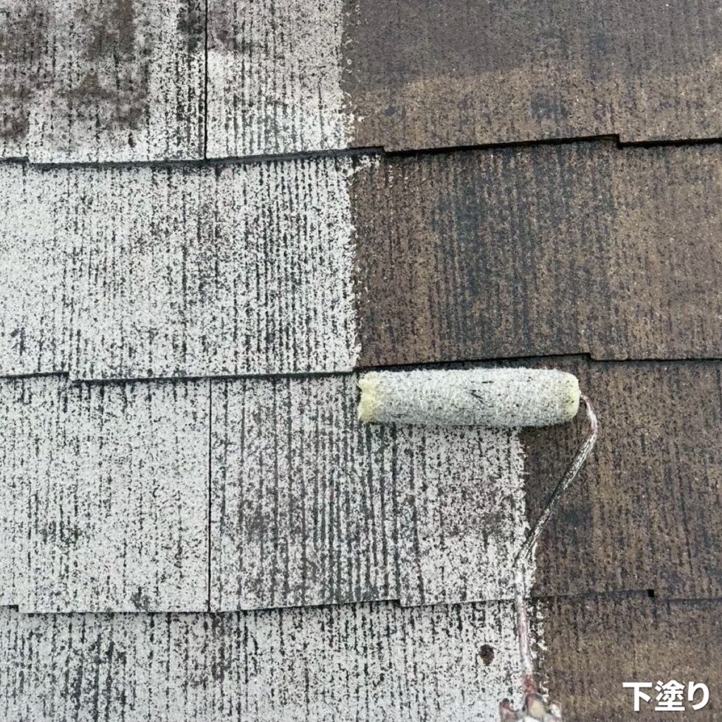 屋根材と塗料の密着性を高めるために、専用の下塗り材を1回目として塗布します。