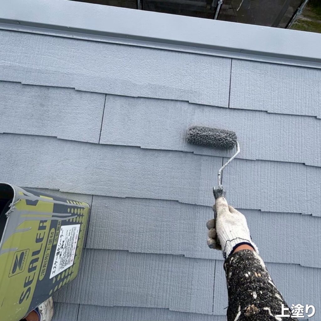 中塗りと同じ主材を丁寧に重ね塗りし、屋根全体を紫外線や雨風からしっかりと保護します。