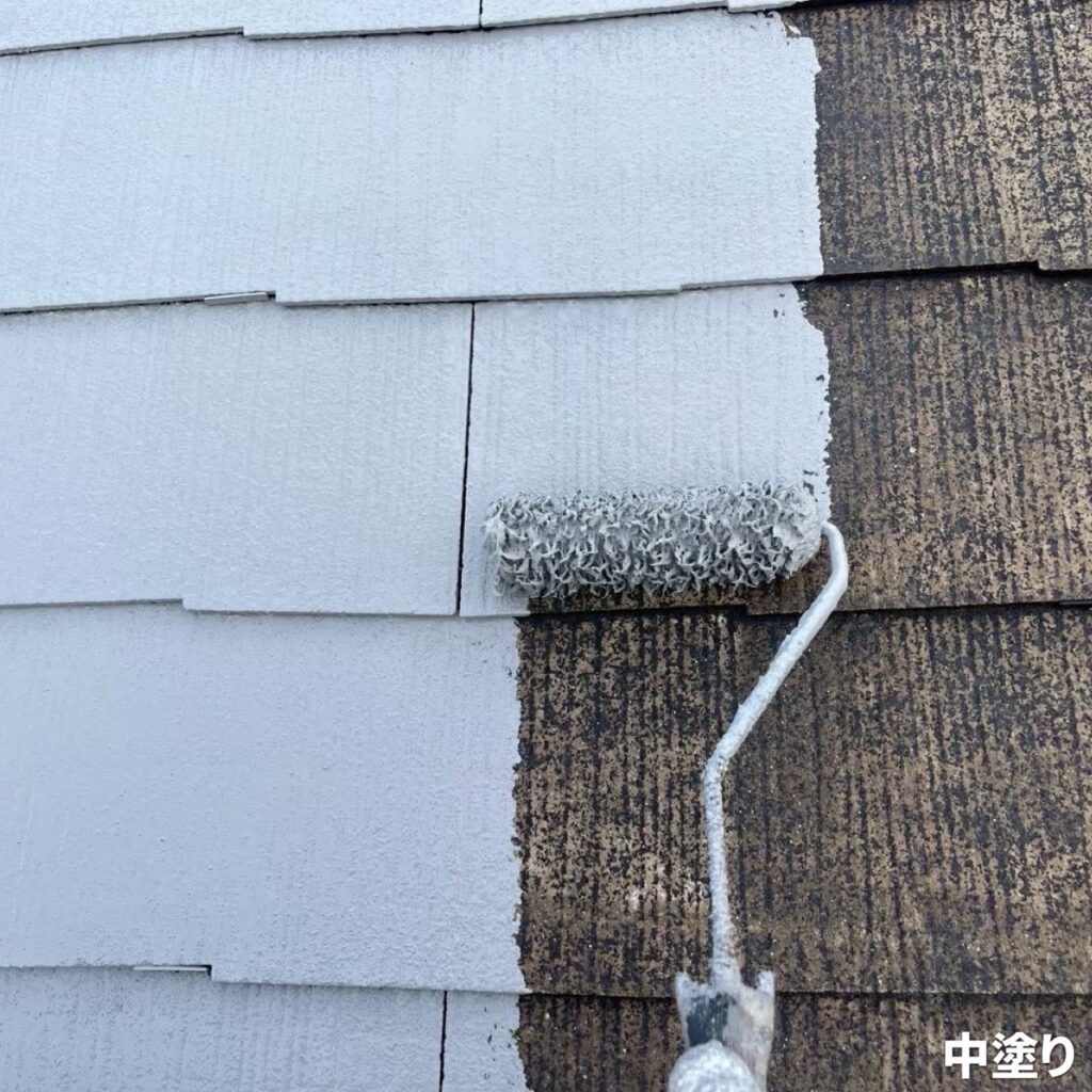 中塗りは、塗膜に厚みを持たせ、屋根の防水性・耐久性を高める工程です。